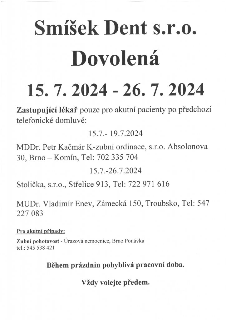 Smíšek Dent s.r.o., zubní ordinace - DOVOLENÁ