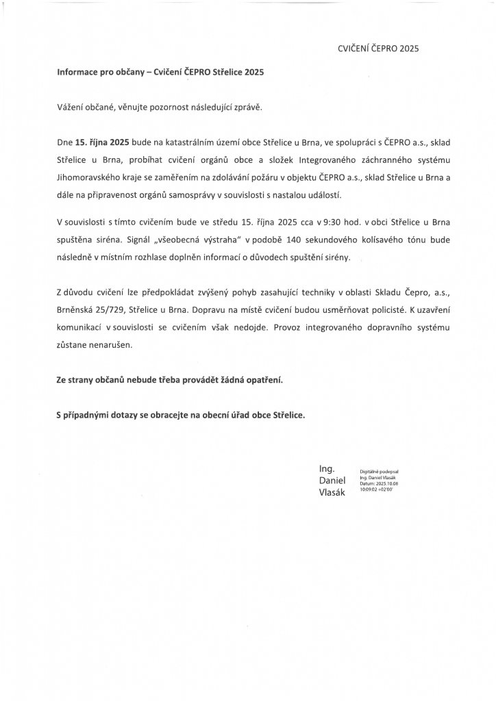 Informace pro občany - Cvičení ČEPRO Střelice 2025