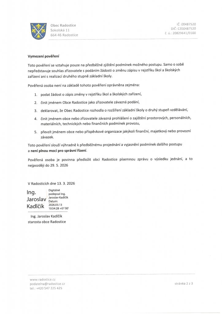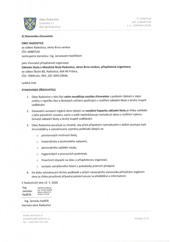 Stanovisko Obce Radostice (zřizovatele) k rozšíření ZŠ o druhý stupeň vzdělávání